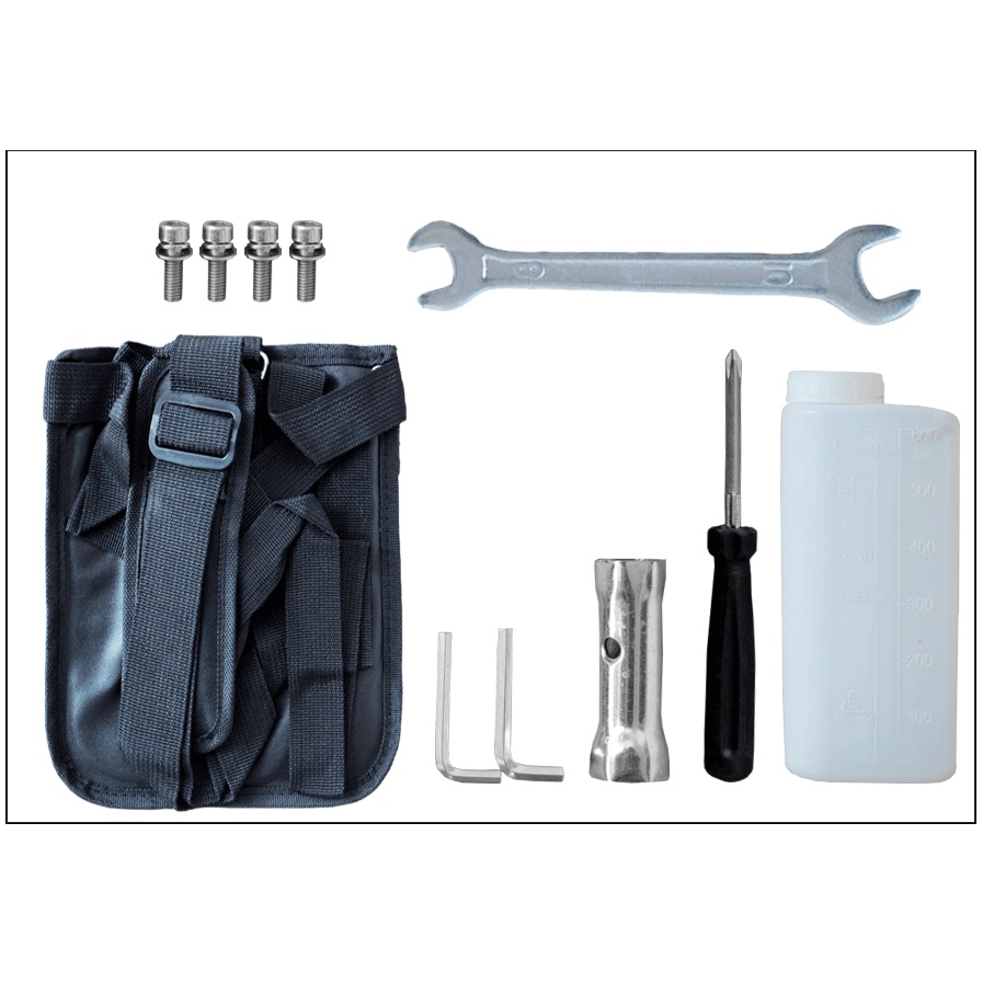 Bộ phụ tùng dụng cụ bao gồm : 1 bình pha, 1 dây đeo và pas gắn dây đeo 1 cái, 1 lưỡi cắt cỏ (305mm x 90mm x 25,4mm x 1,6mm), 1 chắn cỏ, 1 tay cầm trái và 1 bịch phụ tùng (bulon, lục giác, lục giác 4 – 5, khóa mở bugi).